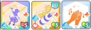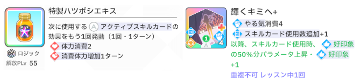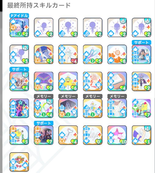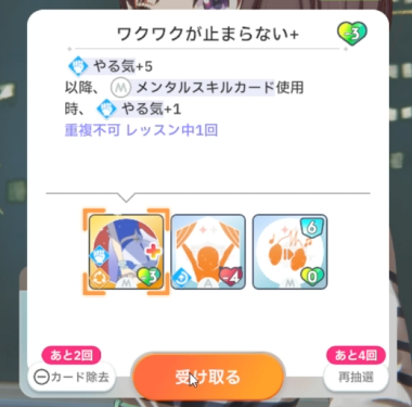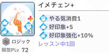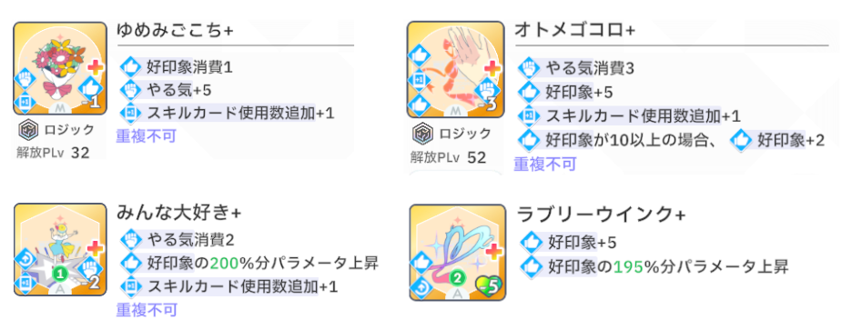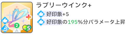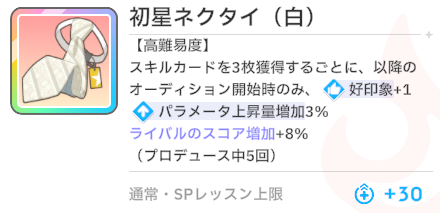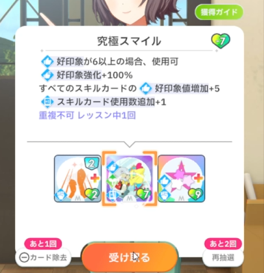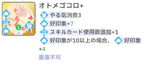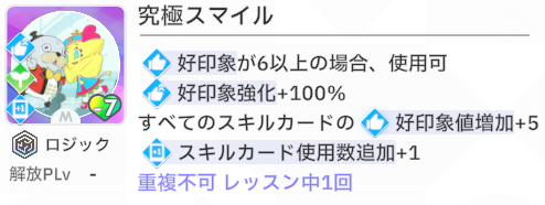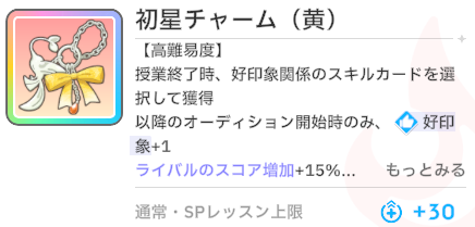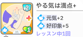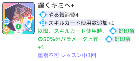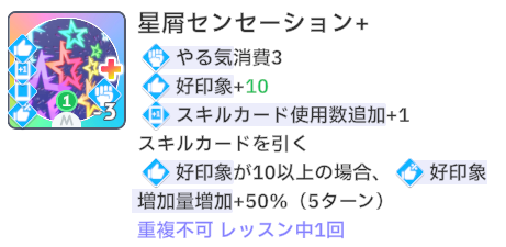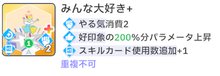 スキルカード3枚取得毎に、オーディション開始時好印象バフ。発動回数5回なのでプロデュース中に15枚はスキル取得する必要がある。こちらも意識しなくても普通に育成すれば5回発動する。