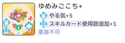やる気を稼ぐループパーツで、他のパーツは好印象関連のスキルで入手できるのに対して「ゆめみごこち」はやる気関連。なのでこのスキルだけメモリー持ち込み。他は道中気合で拾う選択肢もあり