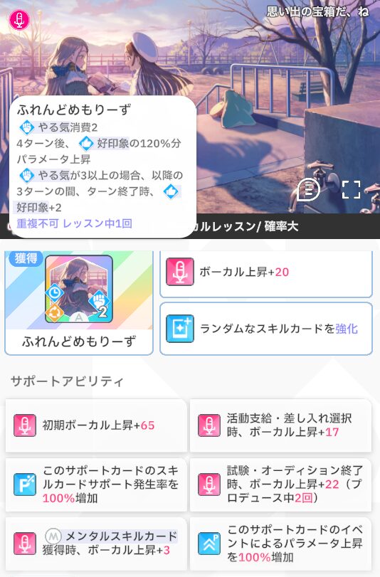 2/9までピックアップしているサポカ「思い出の宝箱だ、ね」、ボーカル上昇+20、固定値+65、活動支給4回として+68、試験2回で+44、Mスキル獲得14回と雑に見積もって、合計239、サポカスキルは好印象向け。サブステータスでも伸ばしやすいのが強いと思う。