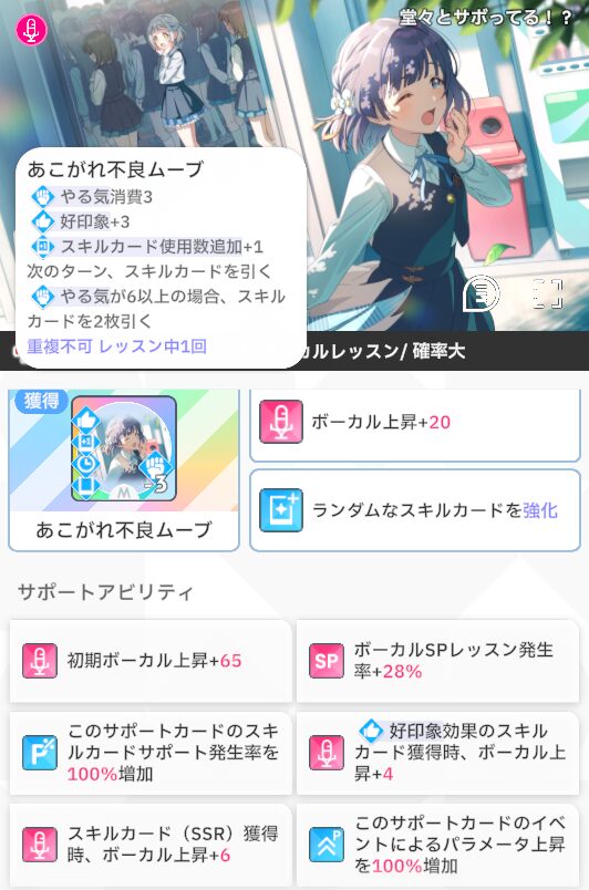 限定SSR「堂々とサボってる!?」、ボーカル上昇+20、固定値+65、好印象効果のスキル獲得は14回として+56、SSRスキル獲得は7回として+42、合計183、サポカスキルは相当強い。