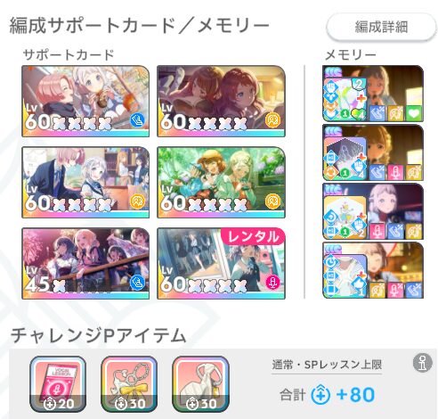 限定SSR「あなたたちのことが好き」、ダンス上昇+20、固定値で+65、メインステのレッスンは3回で+51、Mスキル強化は雑に7回として+63、合計199、好印象型だとPアイテムは噛み合っており強化回数を稼げる。