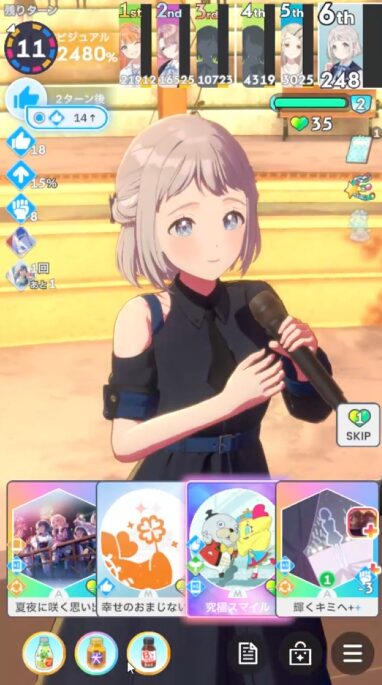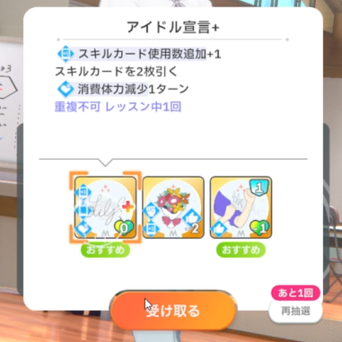 ドリンクは水、スキルは「アイドル宣言」入手。ゆめみごこちと悩んだ。