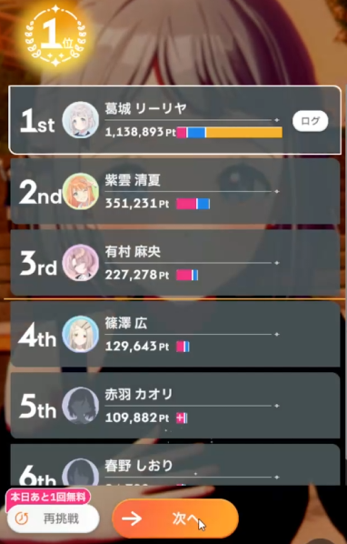 交換SSR「新たな挑戦の成功ですわ!」、初手にPアイテムが入手出来れば強い。Pアイテムが来なかったら+123くらい。初手に来たら+60追加