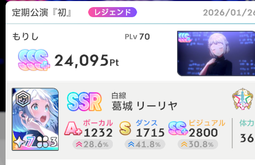 交換SSR「何やってるんだろう、」、ボーカル上昇+20、固定値+65、メインステのレッスンは3回で+18、強化は雑に7回としたら+28、合計131、Pアイテムは強い。