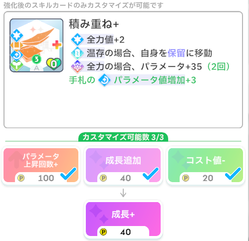 トレンドリーダー、積み重ねを保留に送ってパラメータ上昇回数をバフする動きが強い。これでコスト値増加デメリットがあるので、積み重ねはコスト減少カスタムしても良いかなと考えている。