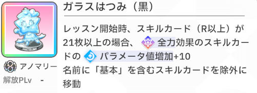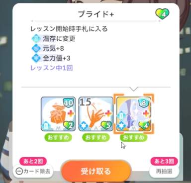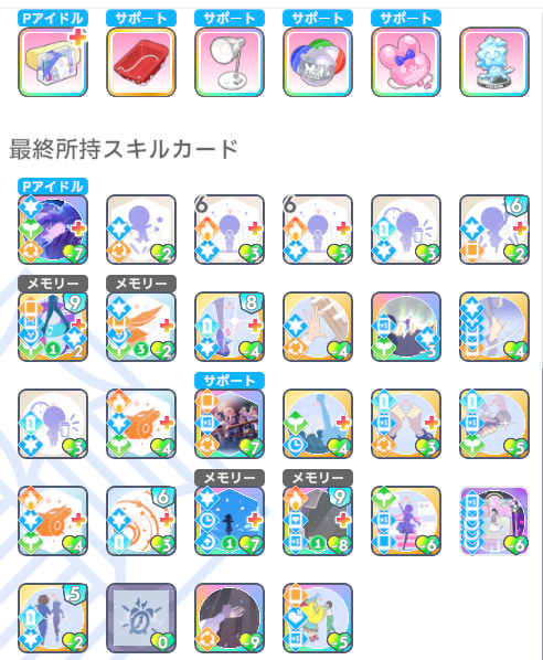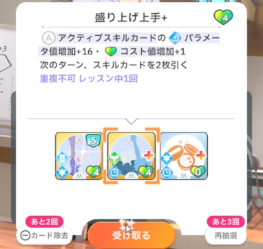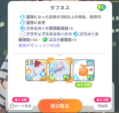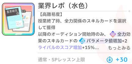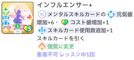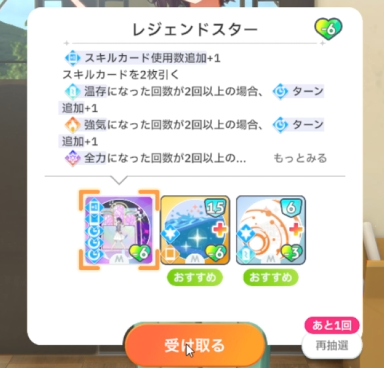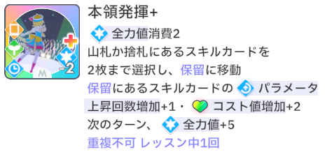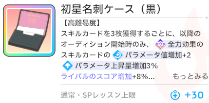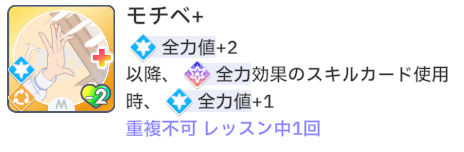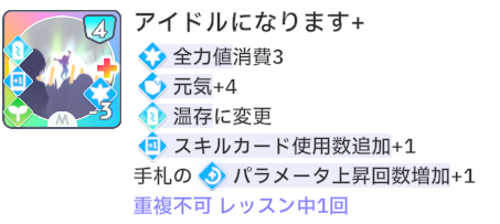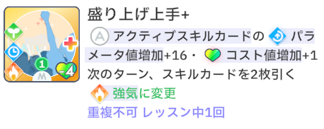 スキルカード3枚取得毎に、オーディション開始時強気スキルのパラメータ増。発動回数5回なのでプロデュース中に15枚はスキル取得する必要がある。こちらも意識しなくても普通に育成すれば5回発動する。