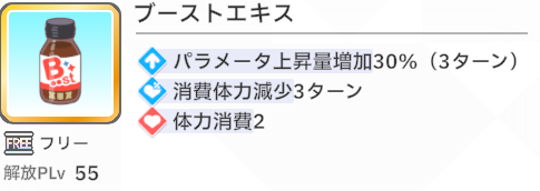 ブーストエキスは、パラメータ上昇量増加バフに加え、消費体力減少バフが噛み合っていて非常に便利。