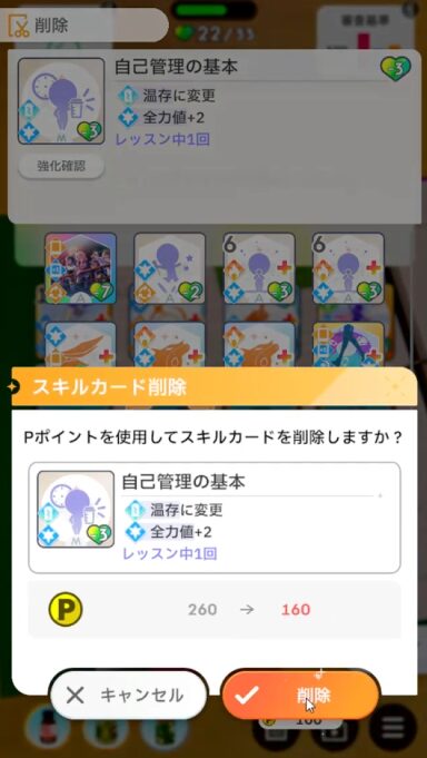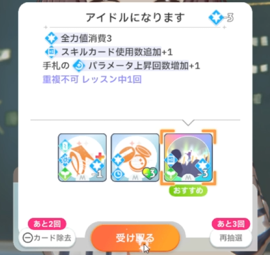 リスキーチャンスやアイドルになりますが未強化なのでカード強化しても良かったけど…ステータス上げるためにカード削除。