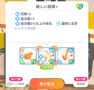 ドリンクは漢方ドリンクを捨てて初星スーパーソーダ、スキルは再抽選して「嬉しい誤算」入手