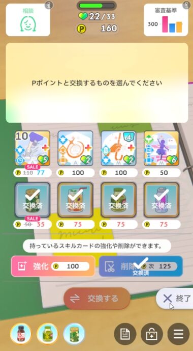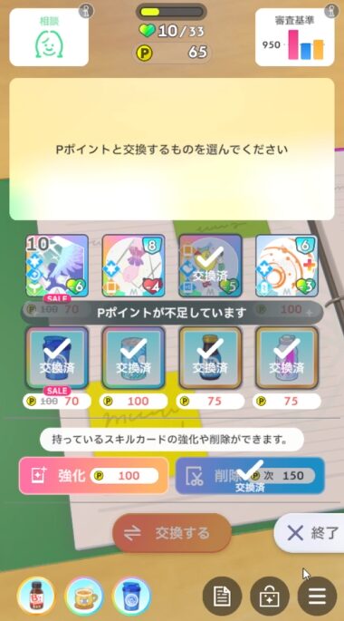 残りのターン全力状態維持で、火力札連打を始めるタイミングで使用する。中間試験でなくても耐えだけど、ないと最終試験は相当きついので最優先で道中確保に動く