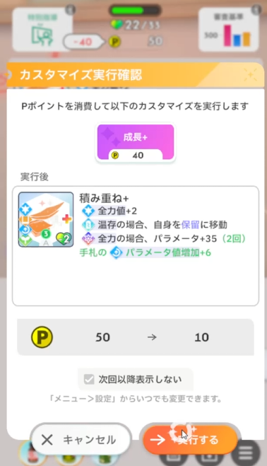 固定値でパラメータを伸ばせるため、育成アイドルのサブパラメータに該当するものを選択