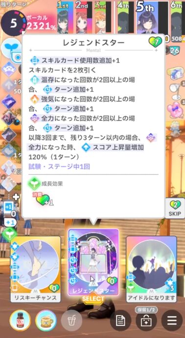 全力型では道中拾いにくい強気スキル。レジェンドスターのために2回は強気に入る必要あり、最優先強気スキルということで評価高い。