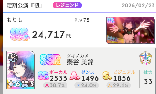 限定SSR「vギャルピ―――スッv」、ボーカル上昇+20、固定値+65、活動支給4回で+68、カード削除2回で+22、合計175、Pアイテムは火力バフよりも元気+8が沁みる。