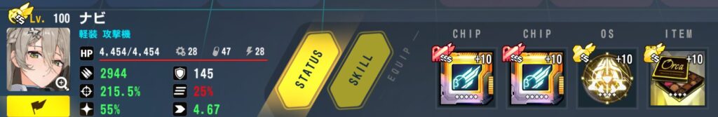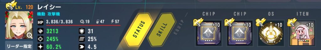 ステータス:バフ込みクリ率100%、命中率280%で残り攻撃