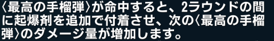 あと、SS昇級スキルには、この「最高の手榴弾」を命中させた敵に、次の「最高の手榴弾」を当てたときのダメージ量が増加すると書いてあるが…効果が謎。ダメージが上がっていない?
