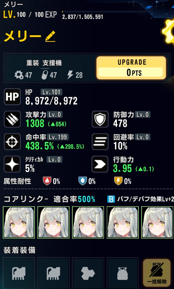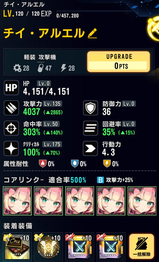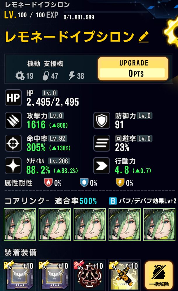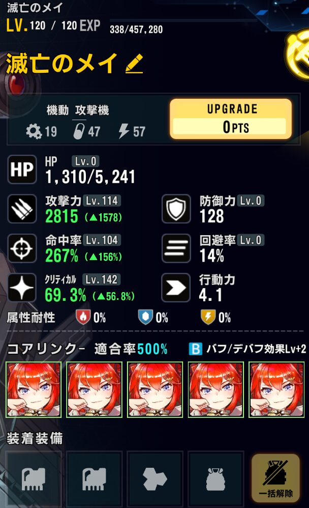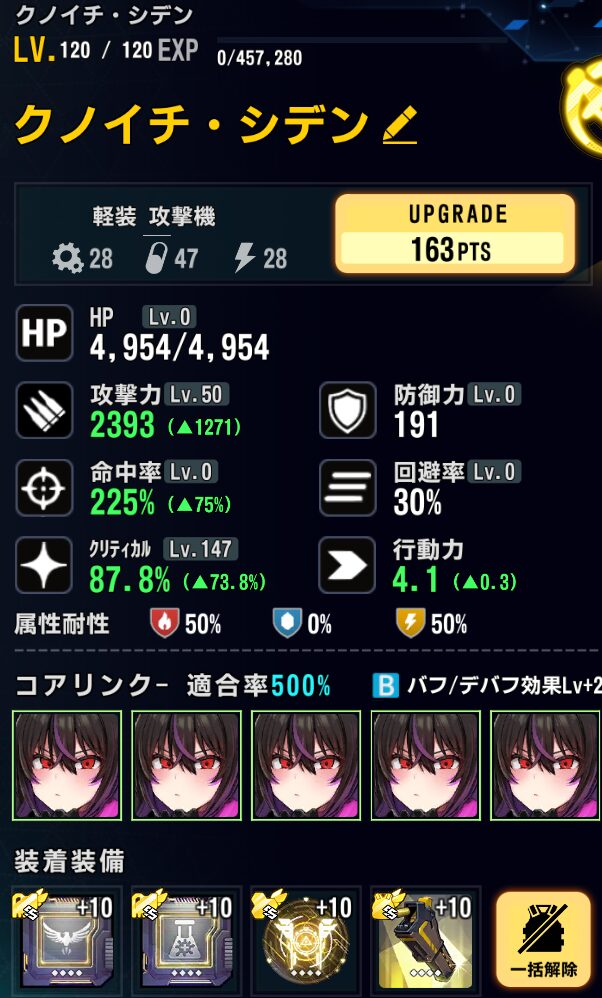 ステータス:バフ込みクリ率100%以上(147)、攻撃調整