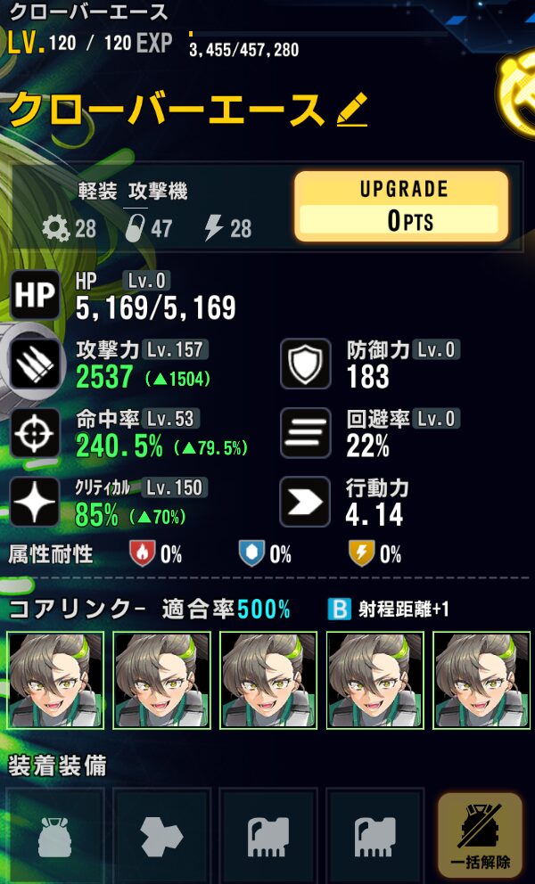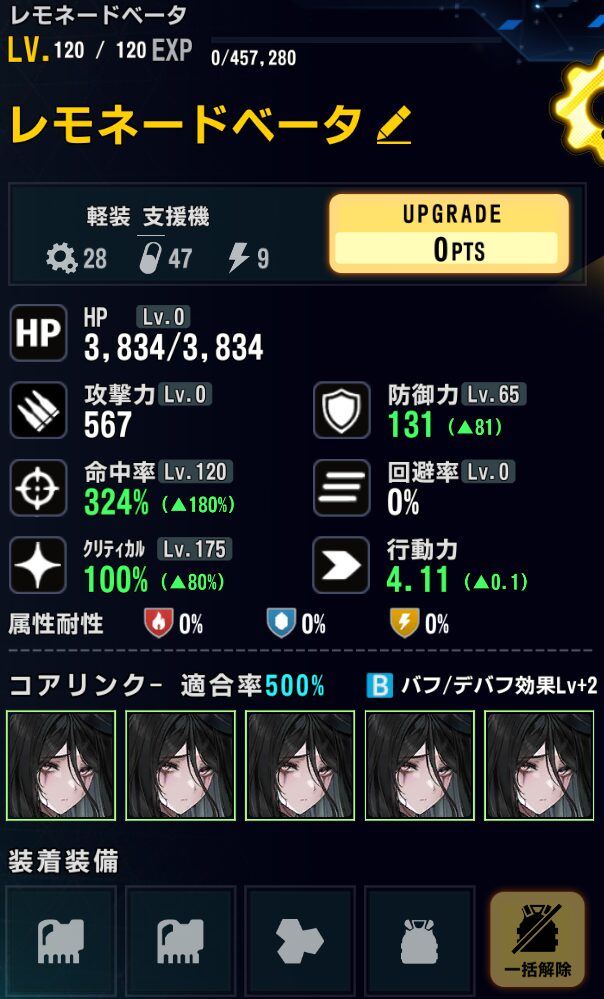 ステータス:バフ込みクリ率100%(175)、命中475%以上(160)、残り攻撃(157)