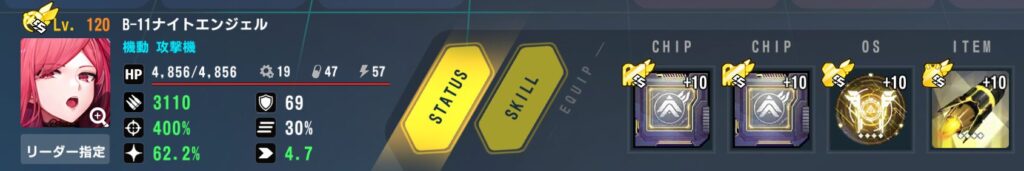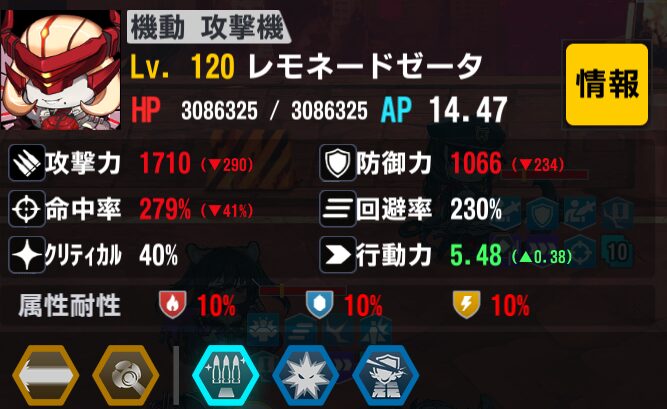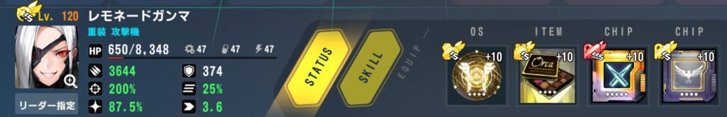 ステータス:バフ込みクリ率100%以上(200)、バフ込み命中366%以上(38)、残り攻撃(122)