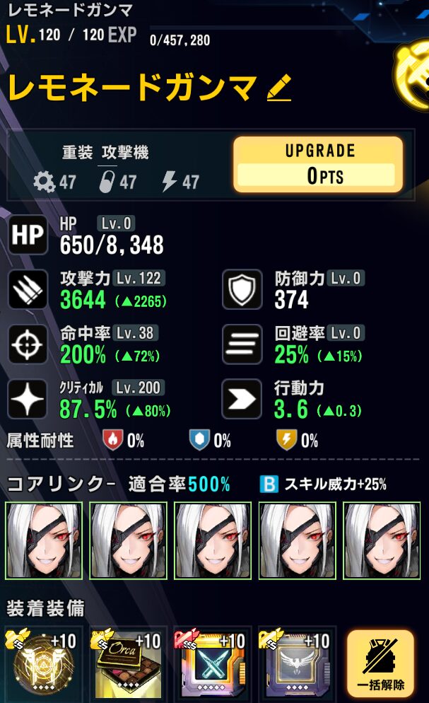ガンマ:誓約、上限拡張レベル120、スキル②優先設定、中破