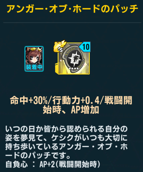汎用装備だと戦闘開始時にAP+2のチョコか、毎ラウンドAP+1.1のエネルギーパックが選択肢になるところだが、ケシクの役割としてはAPと行動力が盛れるこの専用装備が一番合っている。編成次第では1ラウンド目に2回行動も狙える。