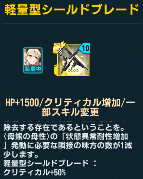 通常はフリッガを中心に十字編成を組む縛りがあったが、この専用装備によって編成が緩和される。替えの利かない装備。