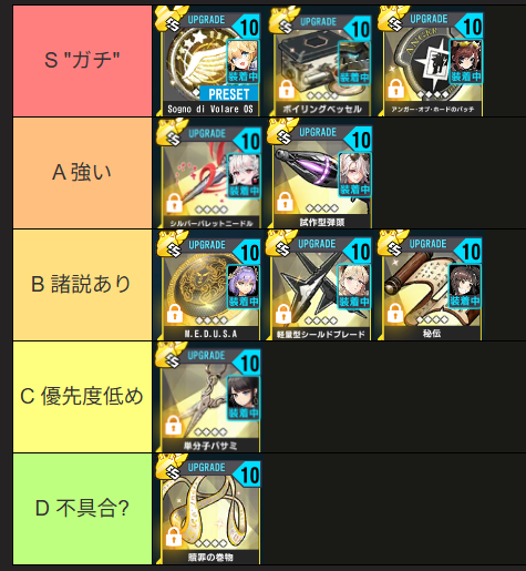 チュァンをメインアタッカーとして運用するなら、専用装備の優先度の高いが、そもそもチュァンの火力を盛るよりもAP行動力を盛って、支援攻撃トリガー役に徹したほうが強い説がある…「諸説」