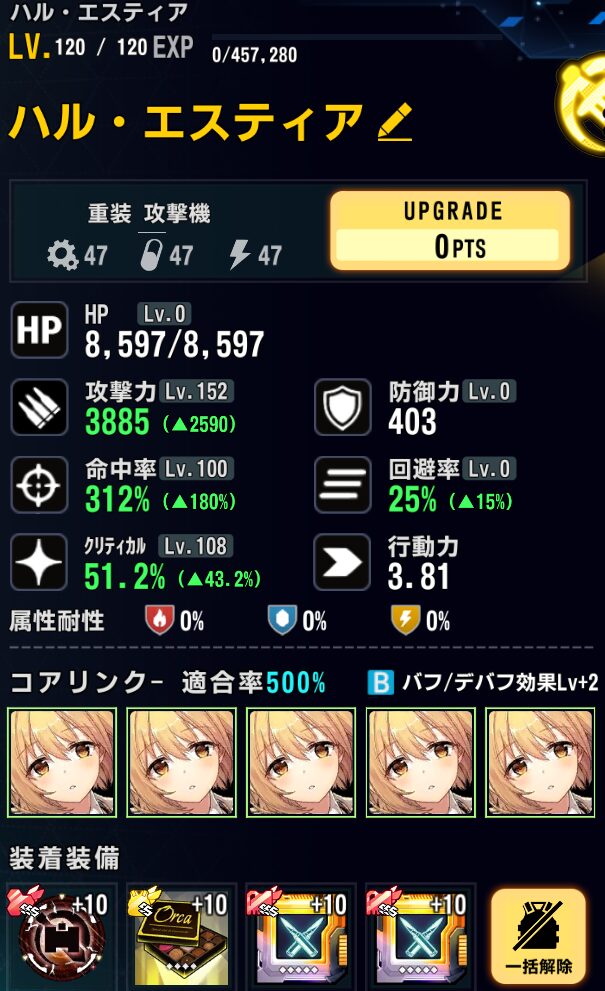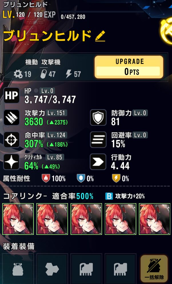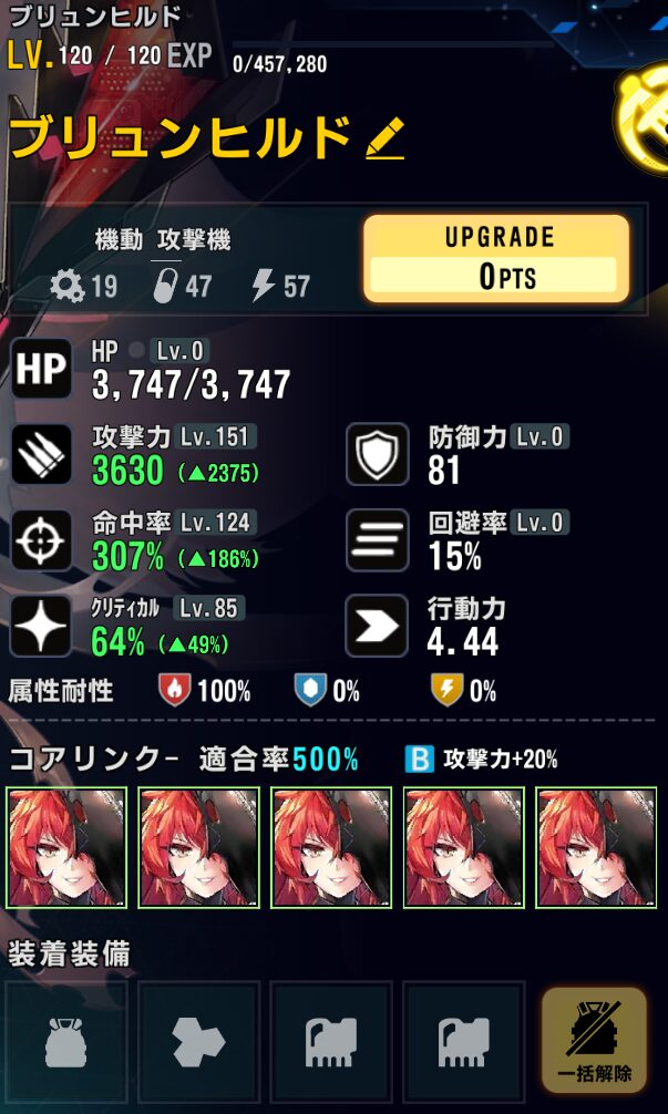 ステータス:バフ込みクリ率100%(108)、バフ込み命中350%(100)、残り攻撃(152)