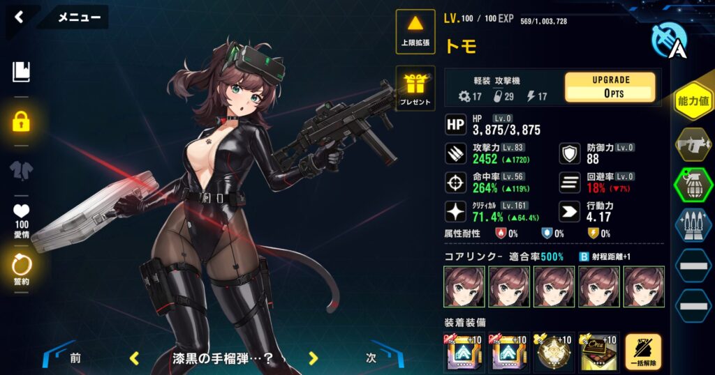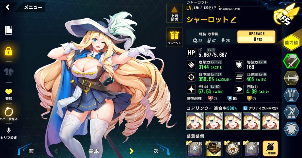 ステータス:バフ込みクリ率100%(161)、命中350%(56)、残り攻撃(83)