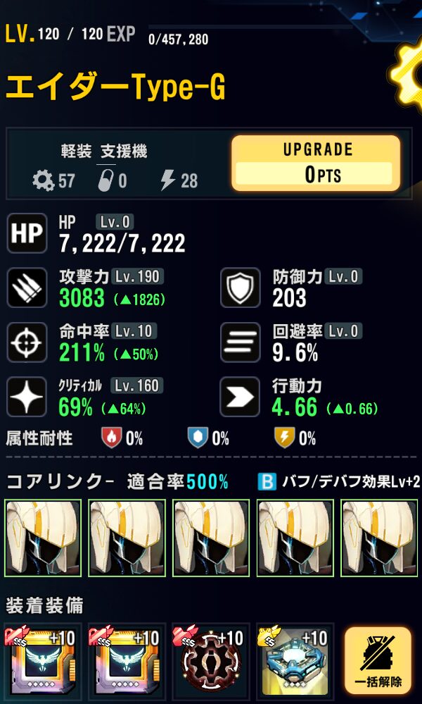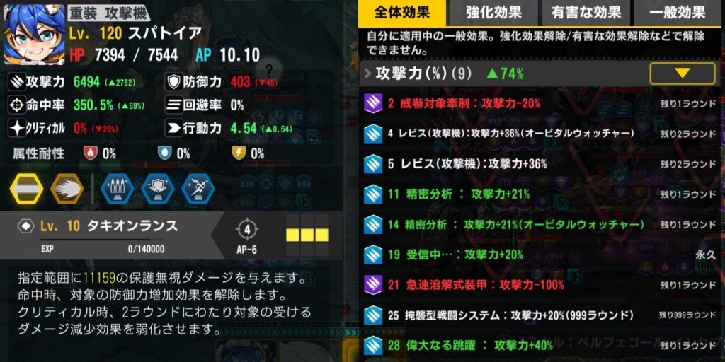 ステータス:バフ込みクリ率100%(160)、バフ込み命中350%(10)、残り攻撃(190)