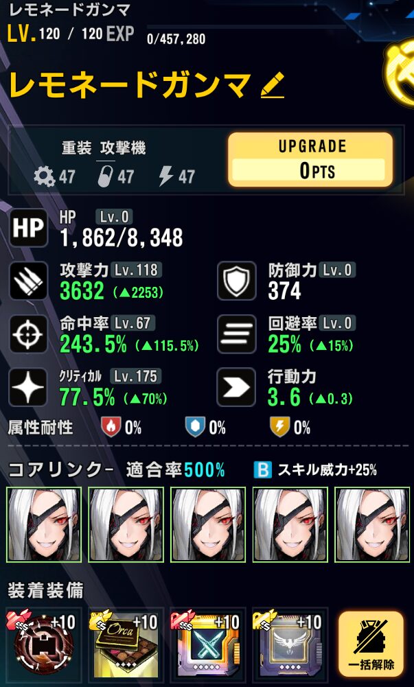 ステータス:バフ込みクリ率100%(175)、命中350%(67)、残り攻撃(118)