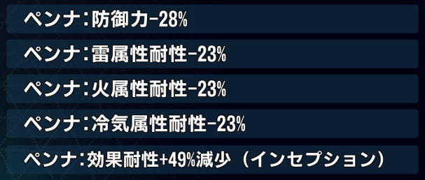 アクティブ②使用時、敵全体の防御力-28%、属性耐性-23%(持続2ラウンド/重複可能)