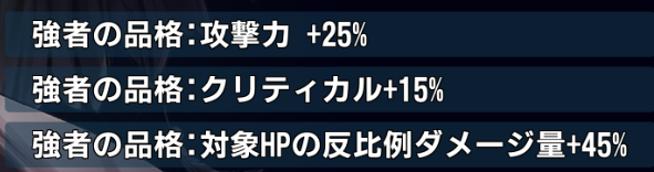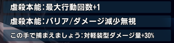 アクティブ②を使用すると、既存の効果の代わりに次のラウンド回避率+500%、さらにアクティブ①が強化され、クリティカル時に防御-100%のデバフ