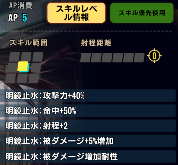 自身が前列にいるか、「明鏡止水」状態の場合、効果1.5倍