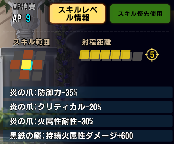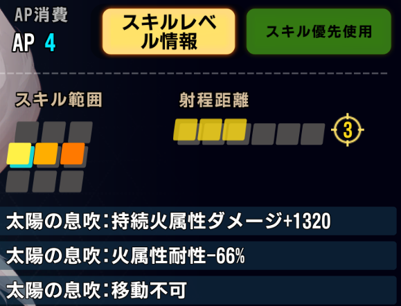 対象に3ラウンドの間、攻撃デバフ、回避デバフ、対象が持続火属性ダメージ状態の場合、効果耐性を無視してデバフ付与