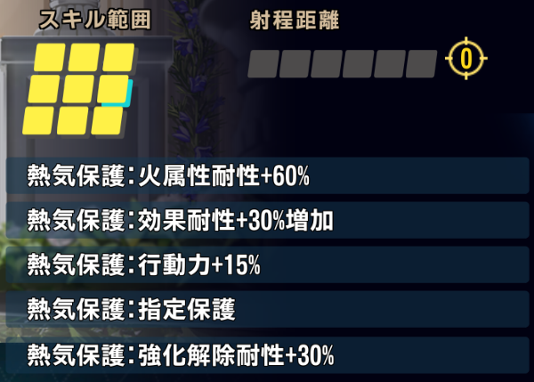 ラウンド開始時、範囲内の味方に火属性耐性+60%バフ、効果耐性+30%バフ、行動力+15%バフ