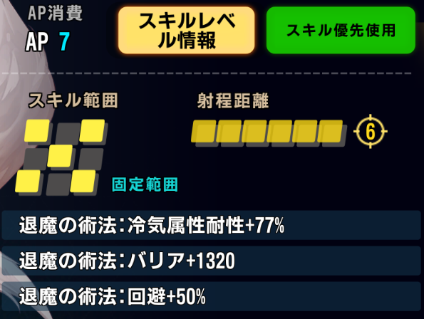2ラウンドの間、範囲内の味方の冷気属性耐性+77%、バリア+1320
