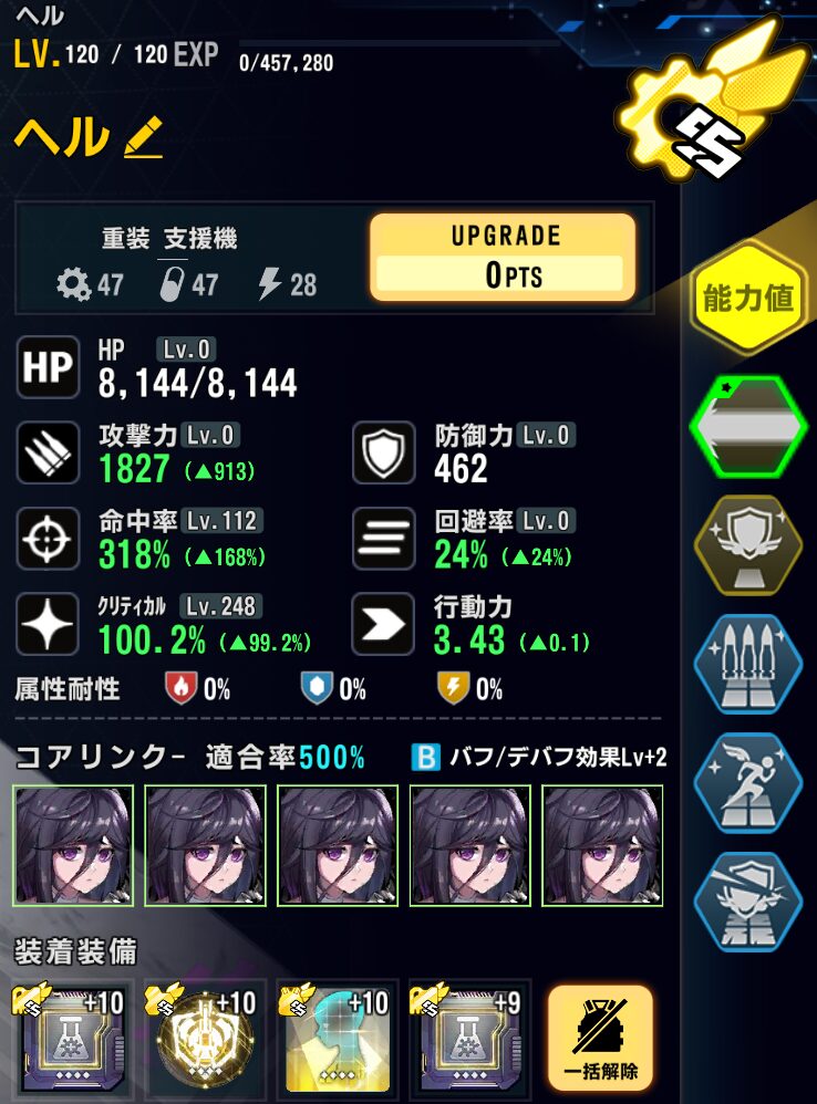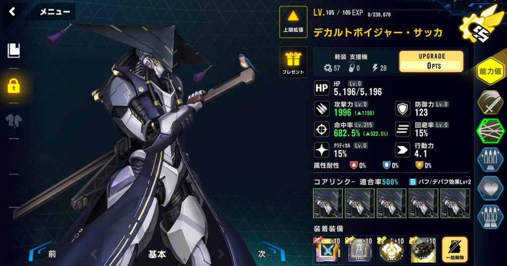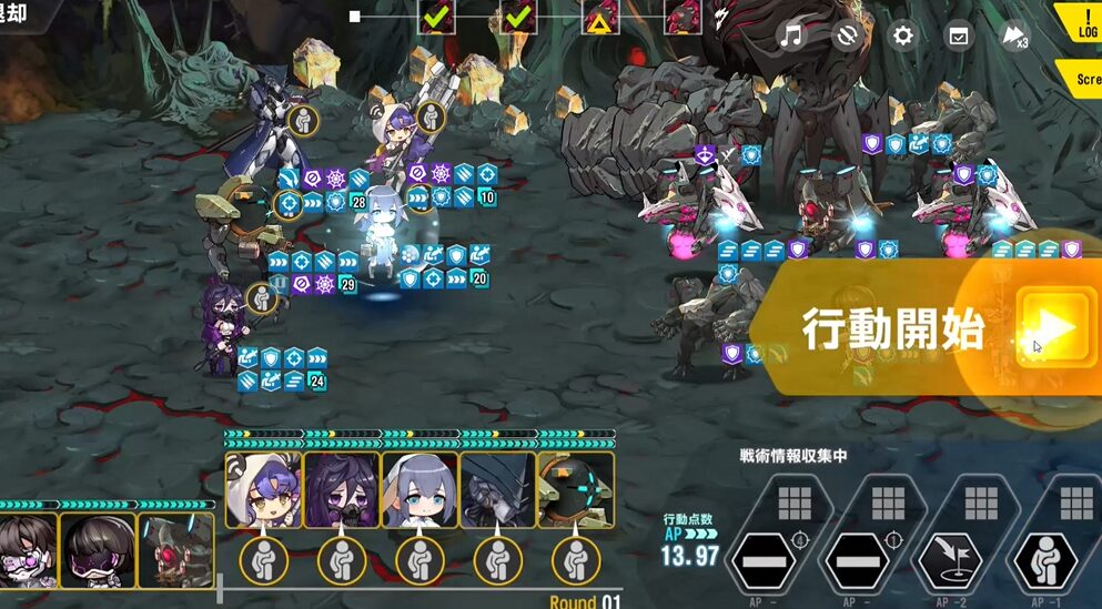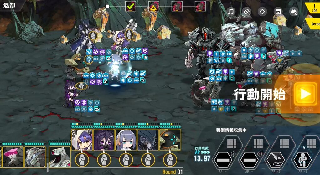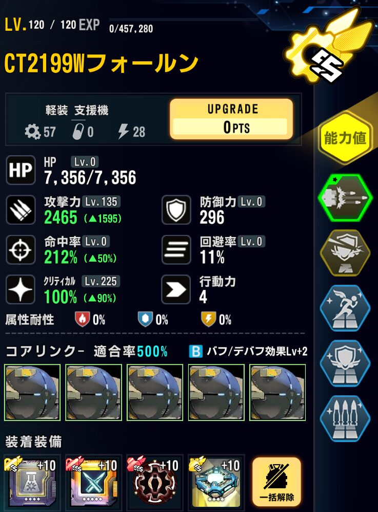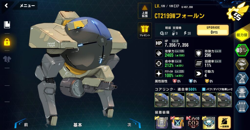 適合戦闘員のAPバフで最速1ラウンド目に行動しないように軽装型支援最適化システムではなく、標準型戦闘システムを採用。行動力を落としている。