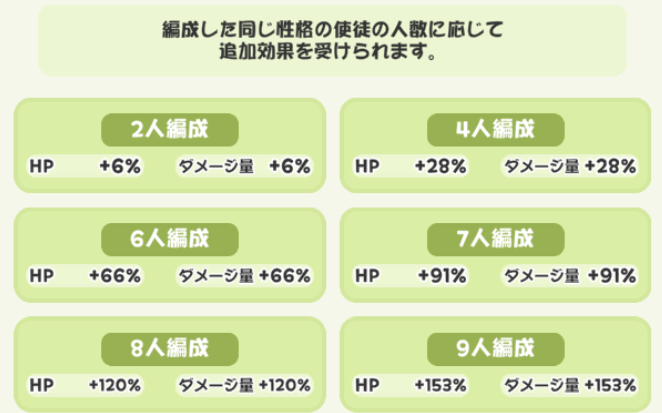 また使途の「性格」と「種族」を揃えることで能力アップのシナジーがある