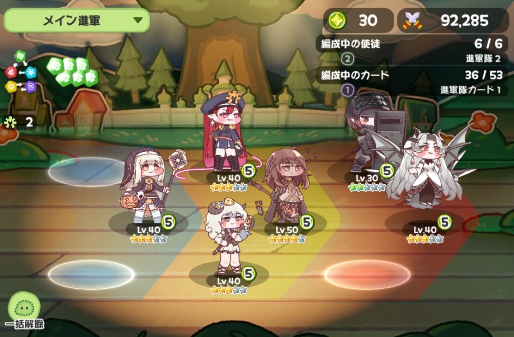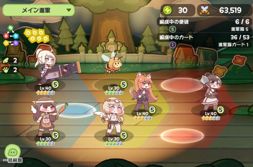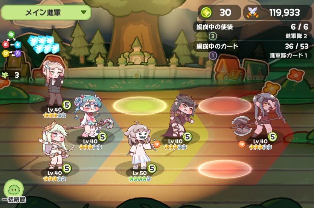 編成は通常6人、前列/中列/後列でそれぞれ3人まで配置