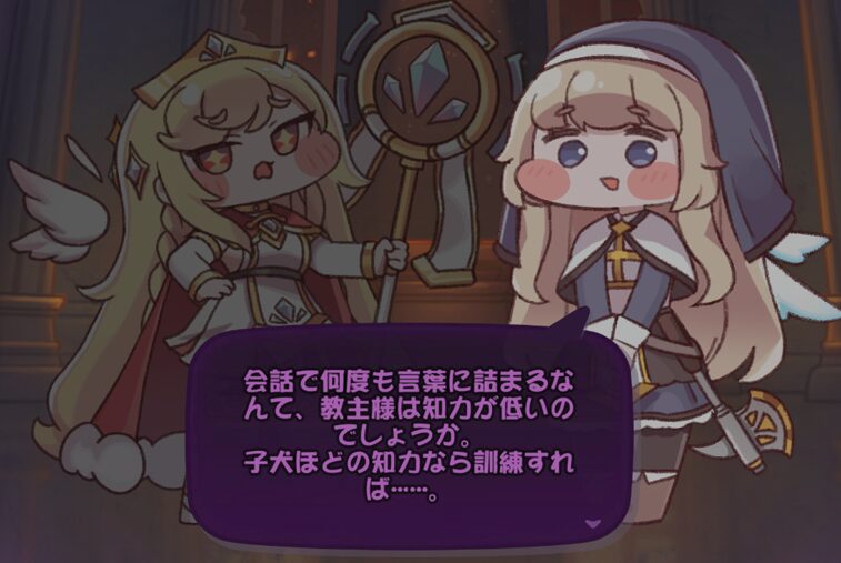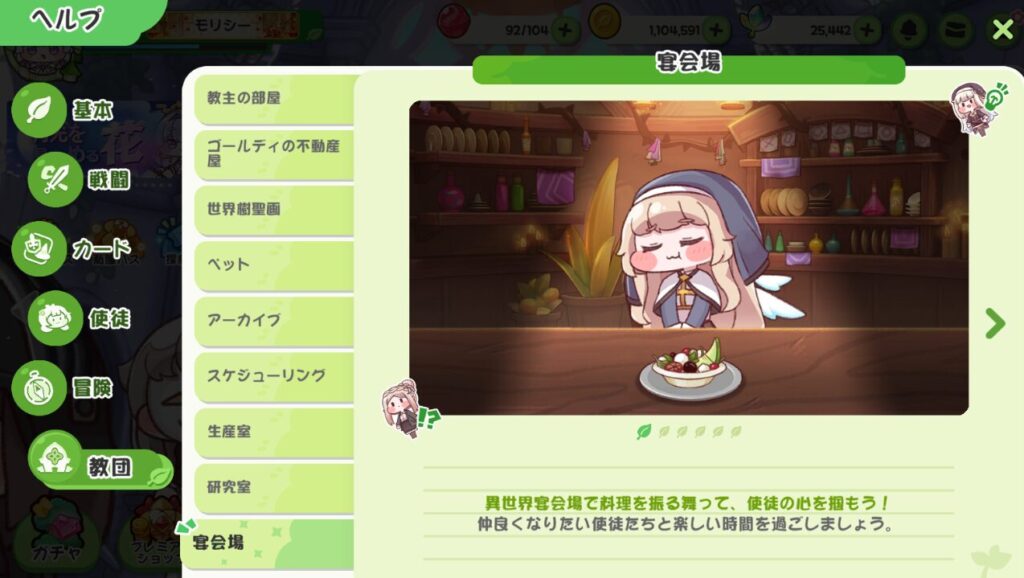 詳細はゲーム内ヘルプの教団⇒宴会場で確認できる通り、宴会場に手持ちの使徒を誘って料理を提供、会話をすることで好感度を上げられる。