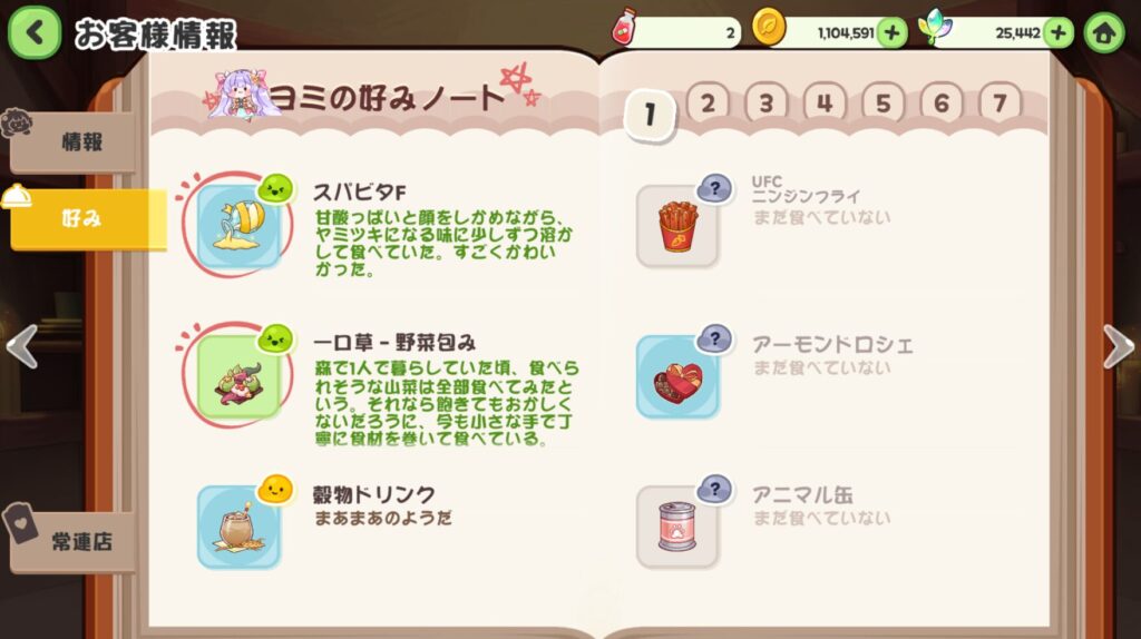 最終的に効率良く好感度を上げるなら、ランクの高い好みの料理を準備する形になるけど…初見ボーナス料理が残っている間はそっちから提供する形の方が良い。
