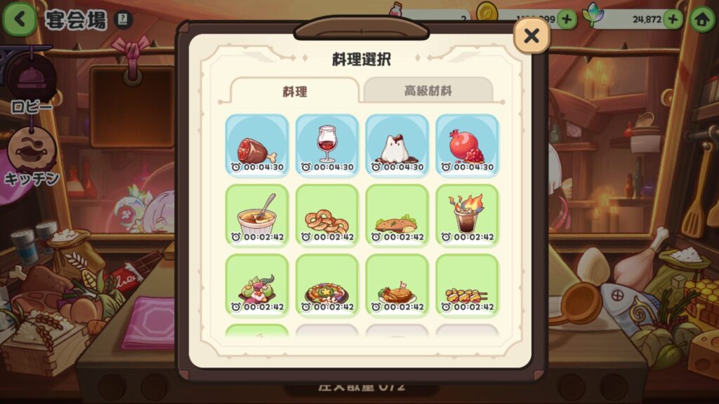 料理のレシピは宴会場のレベルアップで増やせる。